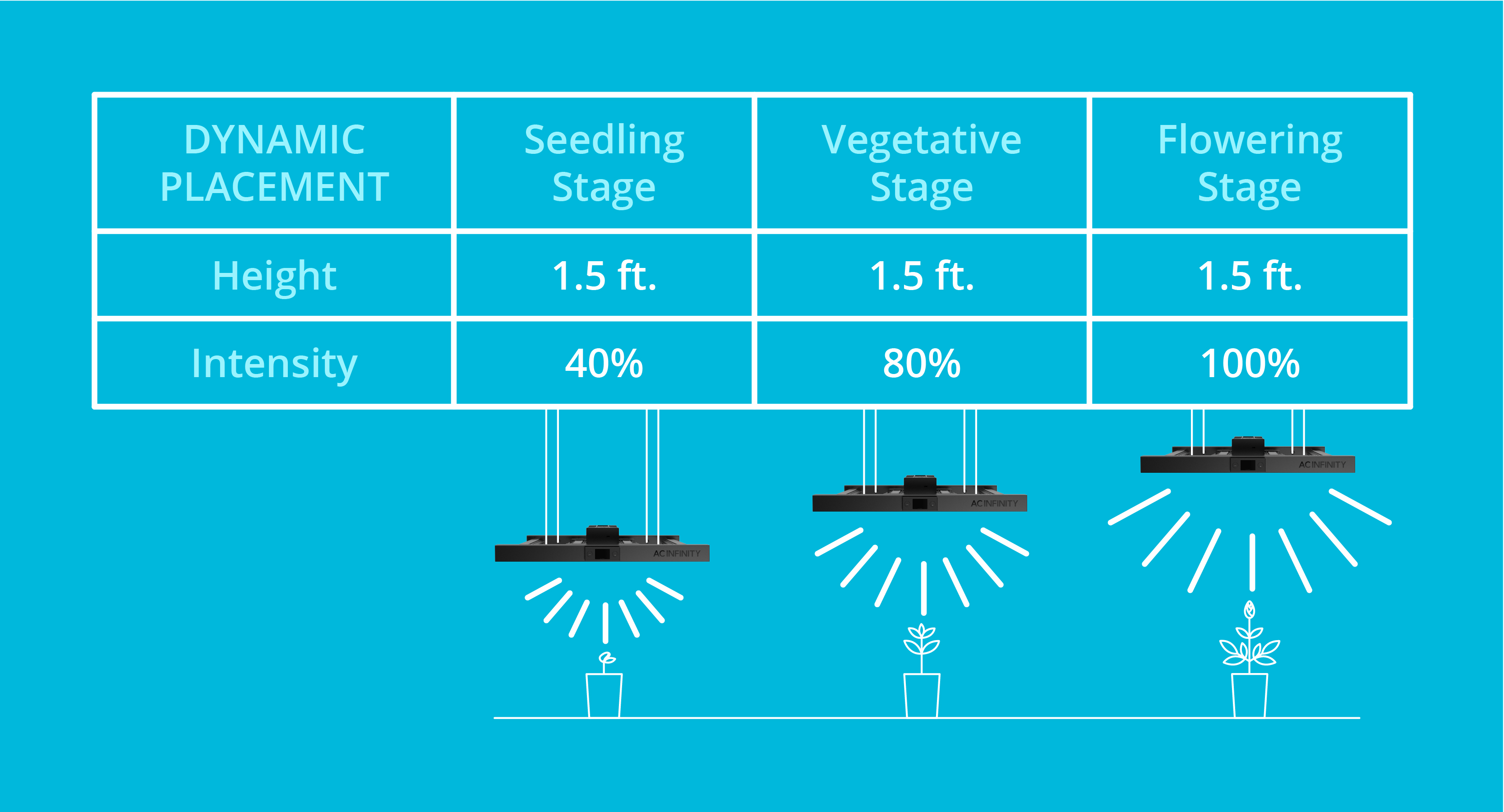 Two critical factors to consider when installing your grow lights are mounting height and light intensity. These settings can vary based on the type of plants you are growing and what growth stage they are in. The following guide will offer two placement options to consider depending on your setup.