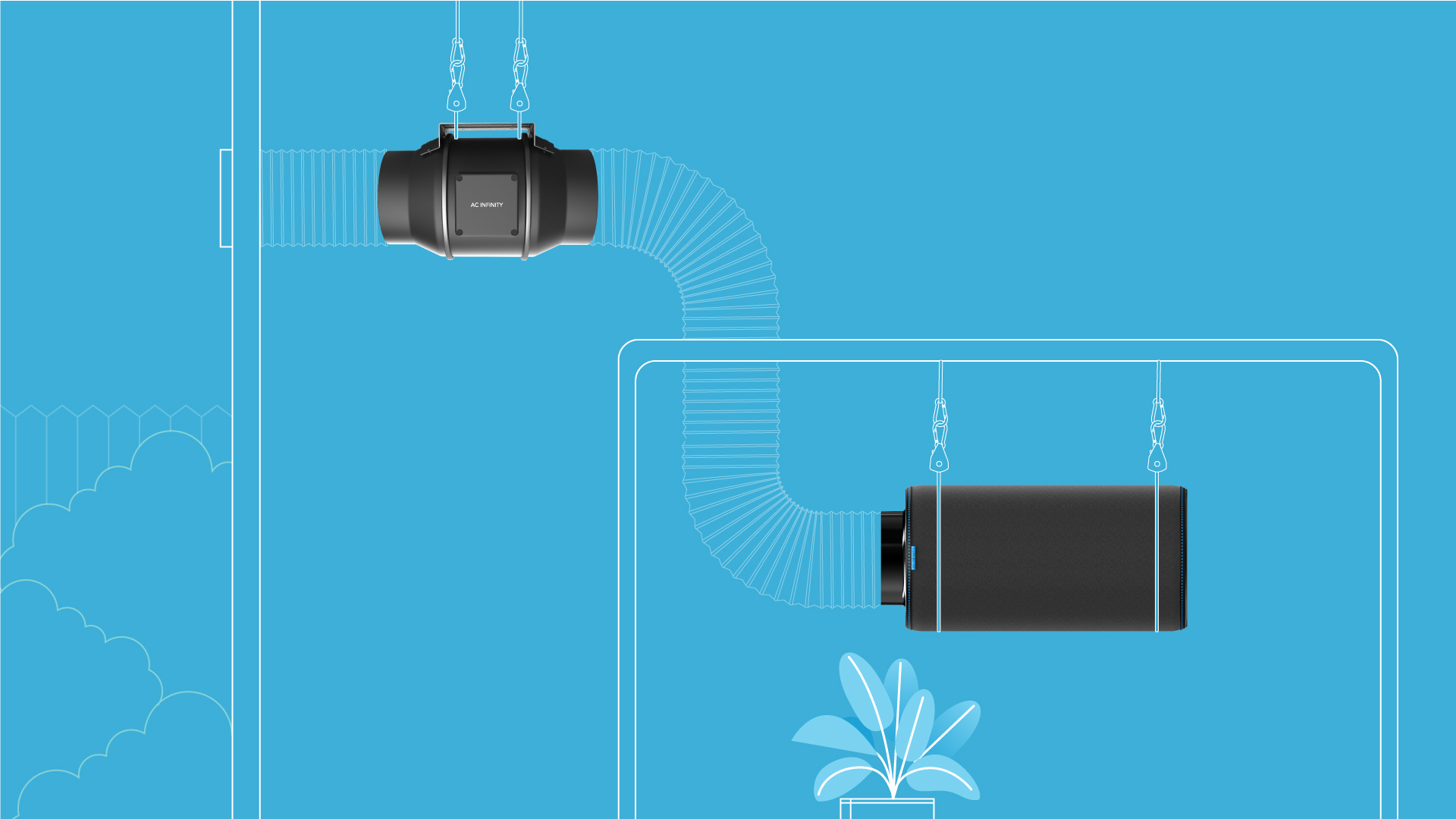 There are many ways to configure these components to bring airflow into your grow space. A typical setup places the fan and the filter inside, which makes it easier to manage while dampening the fan noise. Both can be situated in any order within the ventilation chain if air is being pulled out of your grow space.