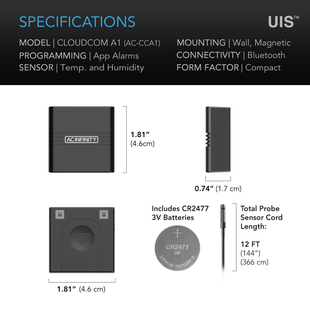 A compact smart hygrometer designed to provide accurate temperature and humidity readings to our app to help you maintain the ideal environment. This model utilizes our steel thermal alloy probe to accurately measure climate conditions and generate daily high and low readings of spot locations, all viewable on our AC Infinity App. It features a compact design that enables you to place it in small and tight spaces. So whether you are wall hanging, magnet mounting, or desktop placing the temperature sensor, you will be able to quickly inspect your space to react to sudden changes. This product is a part of the UIS™ platform of grow devices and smart controllers, designed to integrate with each other to achieve your ideal environment.